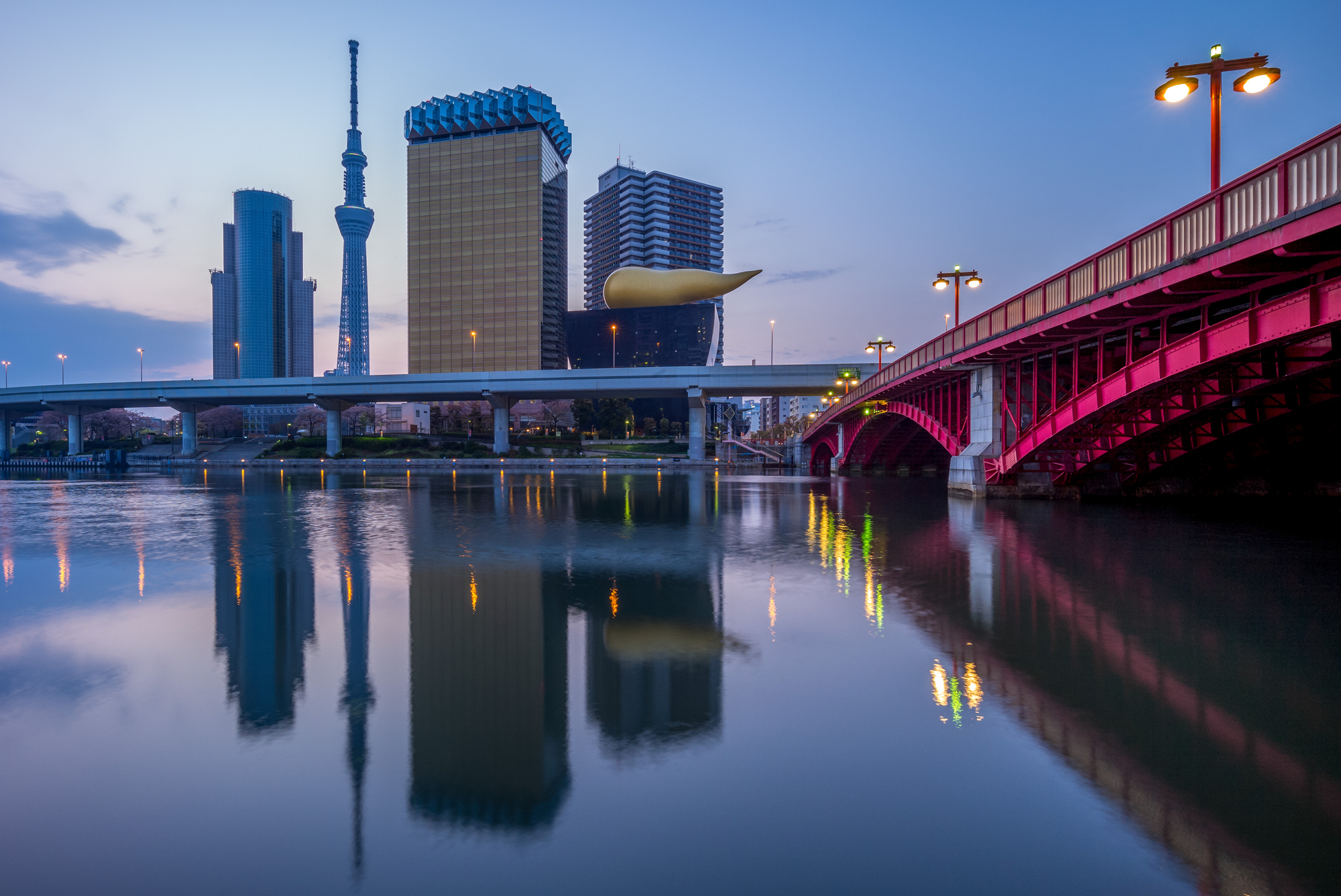 skyline of tokyo city by the river at dawn
